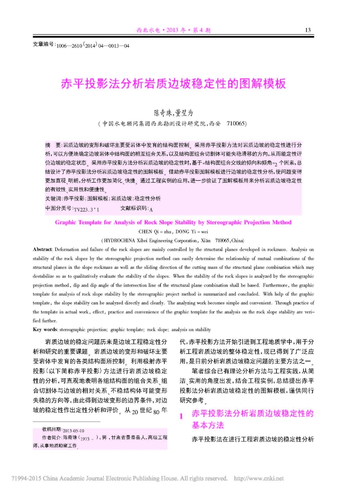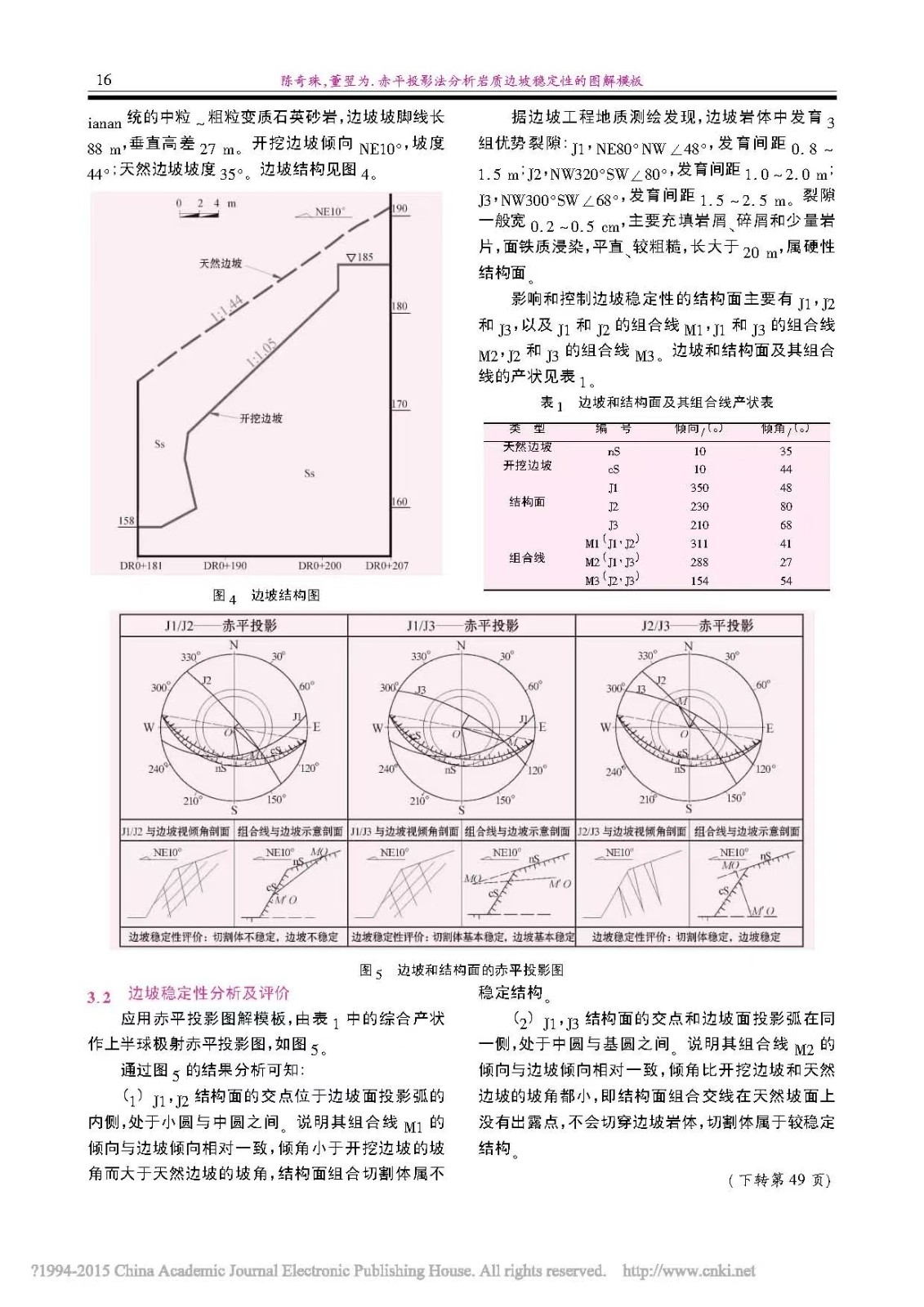 摘 要:岩质边坡的变形和破坏主要受岩体中发育的结构面控制,采用赤平投影方法对岩质边坡的稳定性进行分析,可以方便地确定边坡岩体中结构面的相互组合关系,以及结构面组合切割体可能失稳滑移的方向,从而能定性评价边坡的稳定状态,采用赤平投影方法分析岩质边坡的稳定性时,基于“结构面组合交线的倾向和倾角”2个因素,总结设计了赤平投影法分析岩质边坡稳定性的图解模板。借助赤平投影图解模板进行边坡的稳定性分析,使问题变得更加直观、明朗,分析工作更加简化、快捷,通过工程实例的应用,进一步验证了图解模板用来分析岩质边坡稳定性的有效性、实用性和便捷性。作者:中国水电顾问集团西北勘测设计研究院 陈奇珠,董翌为