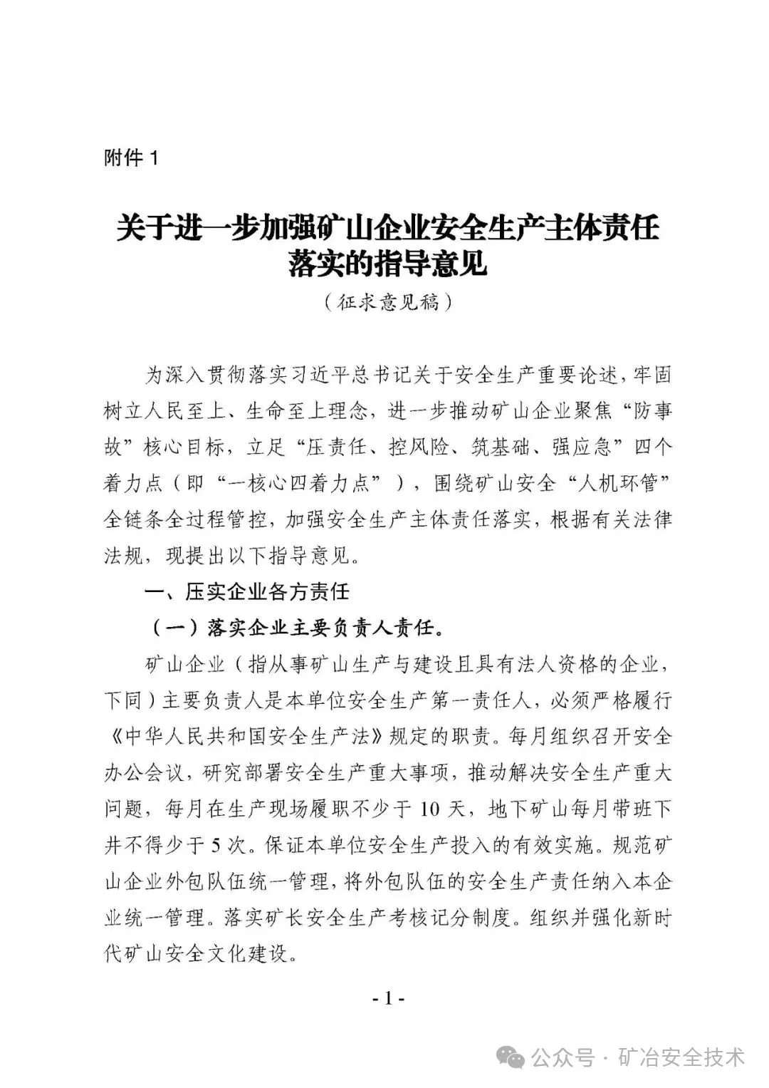 附件:1.关于进一步加强矿山企业安全生产主体责任落实的指导意见(征求意见稿)