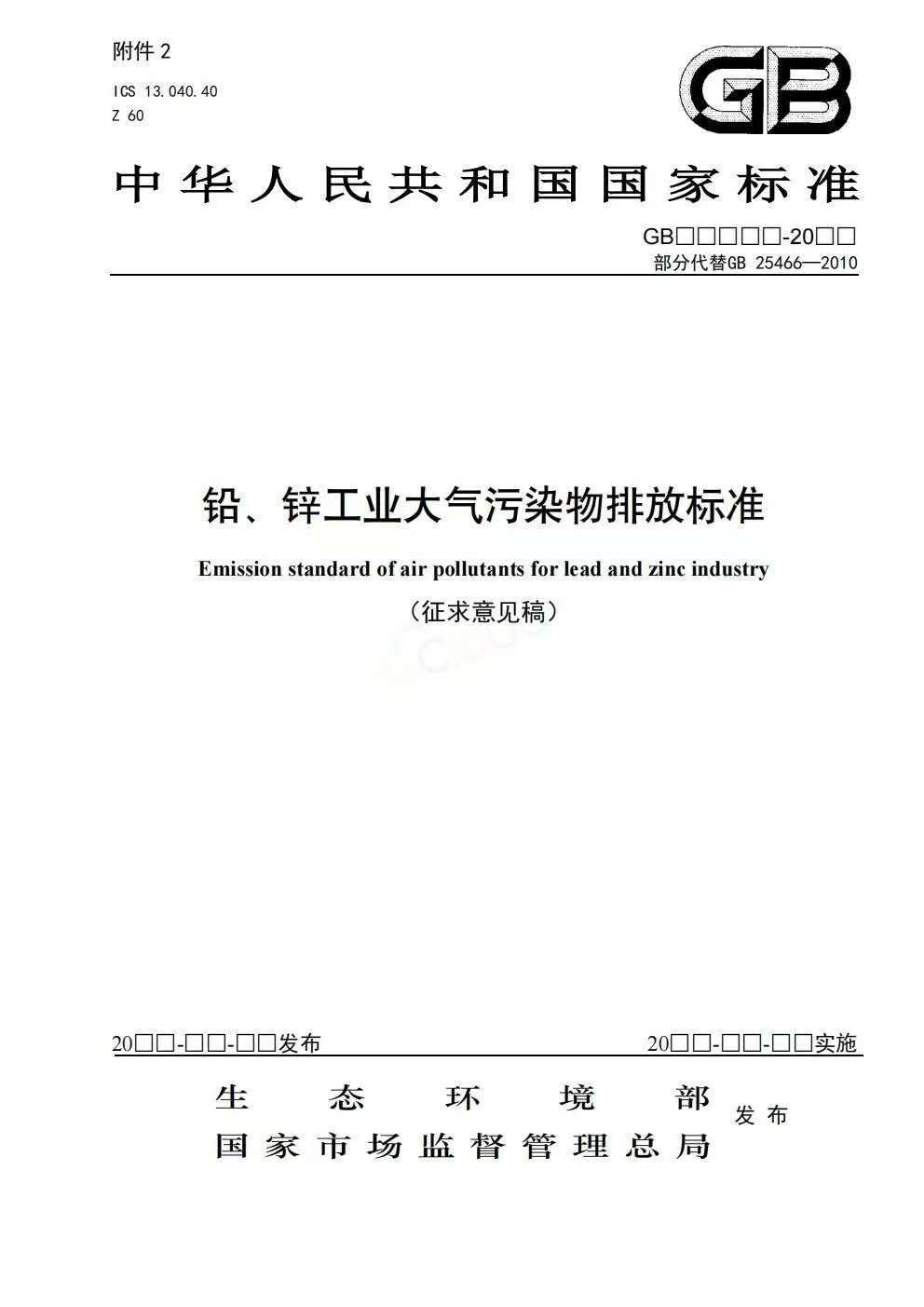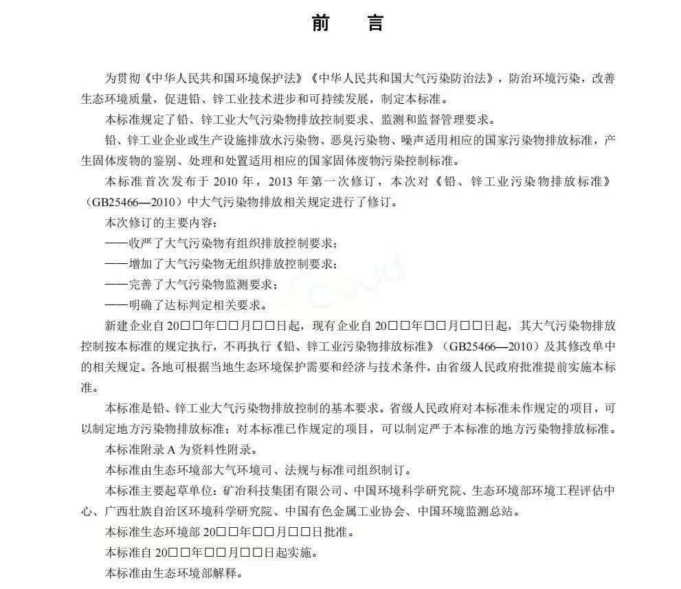 该标准首次发布于2010年,2013年第一次修订,本次对《铅、锌工业污染物排放标准》(GB25466—2010)中大气污染物排放相关规定进行了修订。