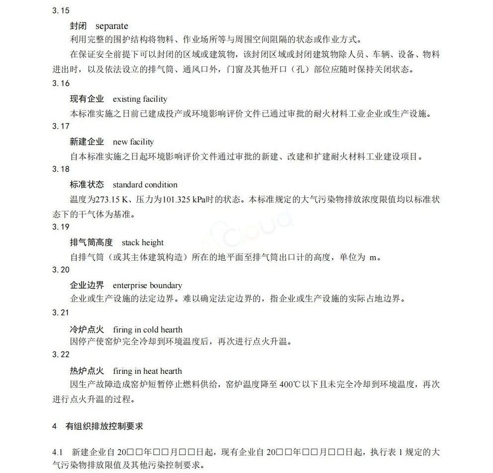 新建企业自2026年1月1日起,现有企业自2027年7月1日起实施以上标准。自以上标准实施之日起,铅、锌工业大气污染物排放控制不再执行《铅、锌工业污染物排放标准》( GB25466-2010 )及其修改单中的相关规定,耐火材料工业大气污染物排放控制不再执行《大气污染物综合排放标准》( GB16297-1996 )、《工业炉窑大气污染物排放标准》( GB9078-1996 )中的相关规定。