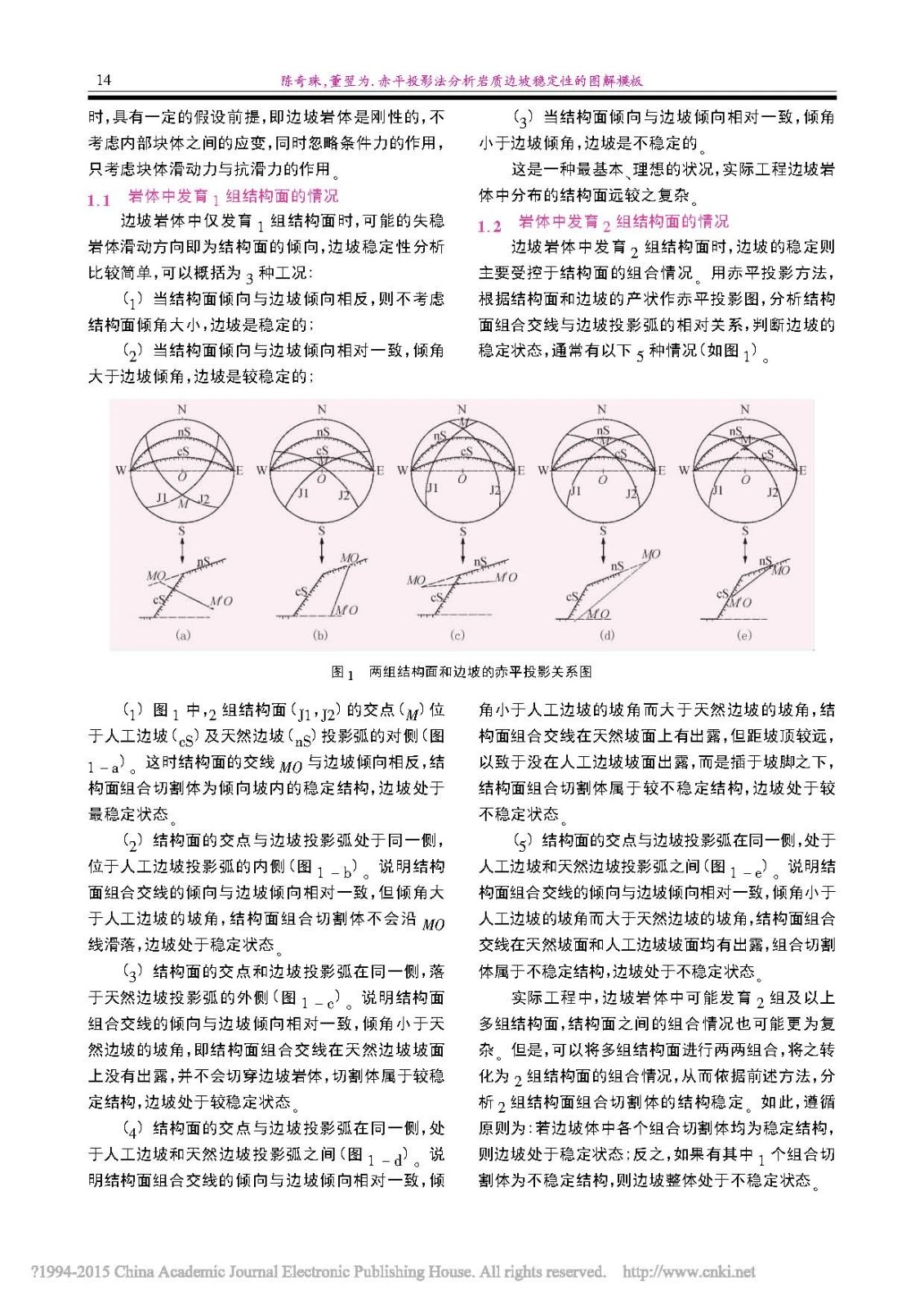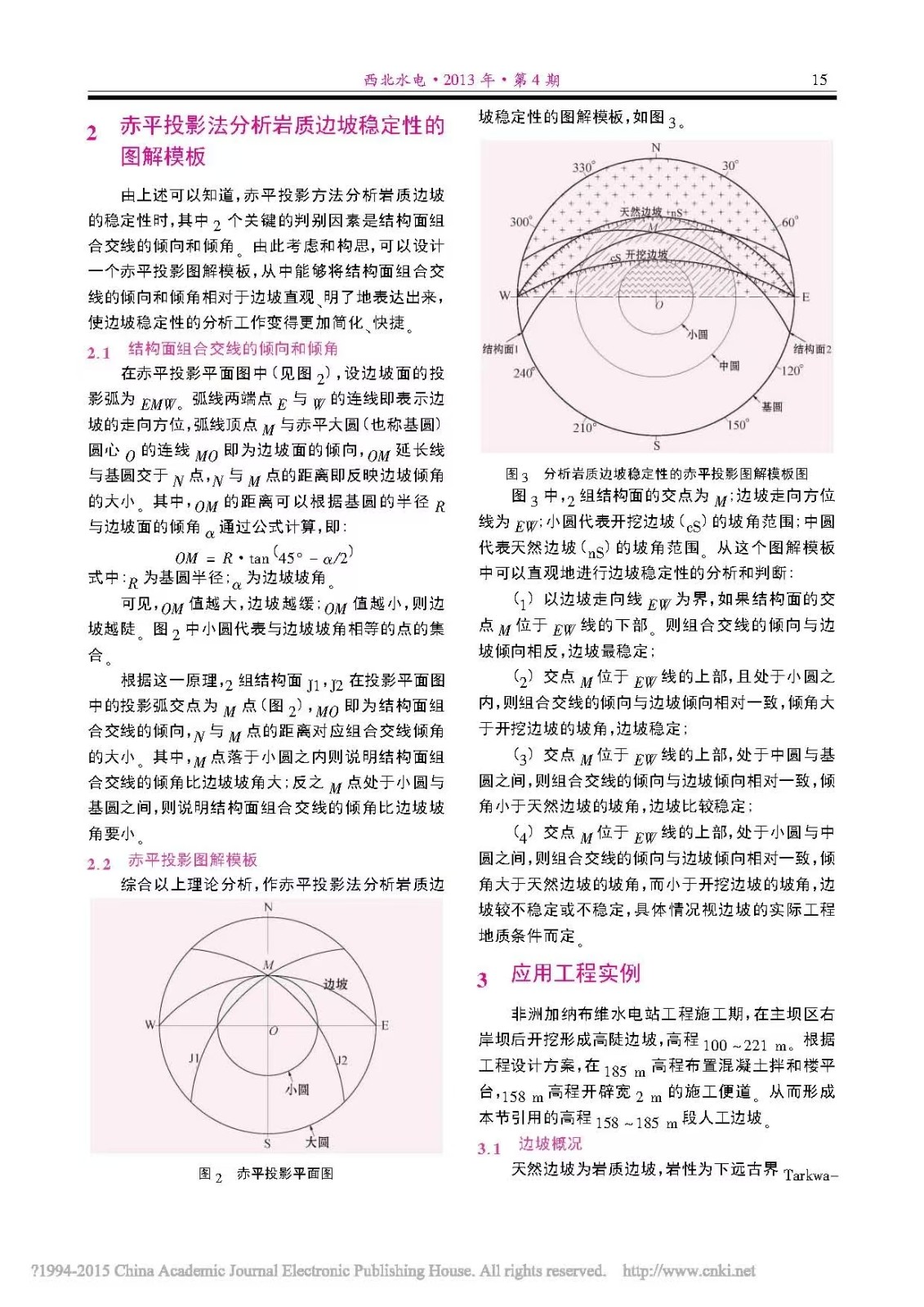 摘 要:岩质边坡的变形和破坏主要受岩体中发育的结构面控制,采用赤平投影方法对岩质边坡的稳定性进行分析,可以方便地确定边坡岩体中结构面的相互组合关系,以及结构面组合切割体可能失稳滑移的方向,从而能定性评价边坡的稳定状态,采用赤平投影方法分析岩质边坡的稳定性时,基于“结构面组合交线的倾向和倾角”2个因素,总结设计了赤平投影法分析岩质边坡稳定性的图解模板。借助赤平投影图解模板进行边坡的稳定性分析,使问题变得更加直观、明朗,分析工作更加简化、快捷,通过工程实例的应用,进一步验证了图解模板用来分析岩质边坡稳定性的有效性、实用性和便捷性。作者:中国水电顾问集团西北勘测设计研究院 陈奇珠,董翌为