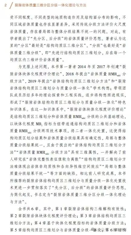 本书所推荐的裂隙岩体结构均质区三维划分与质量分级一体化处置技术更进一步贯彻落实了“先分区、 后分级” 的岩体质量评价思想。